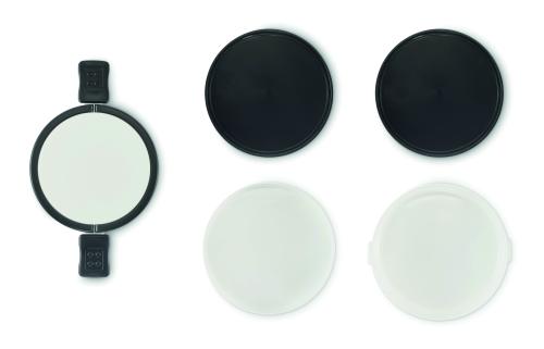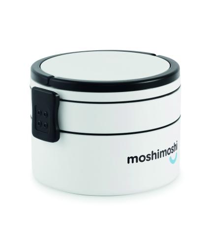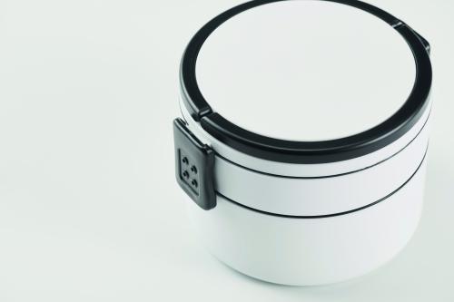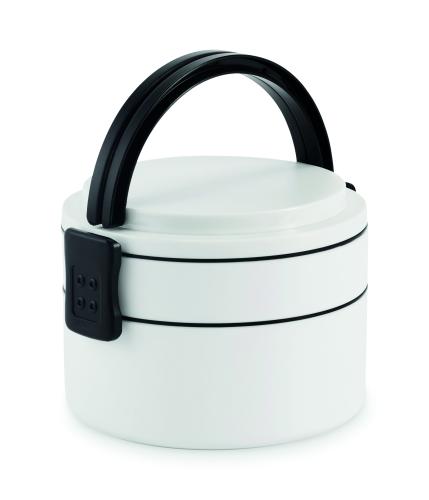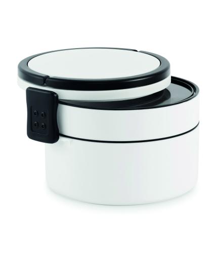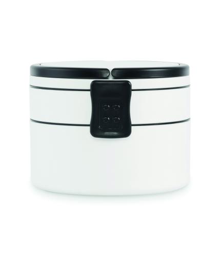 Two-tier round lunch box made of PP with side clip closure and handles. Includes inner lids. Capacity 250 ml top, 700 ml bottom.