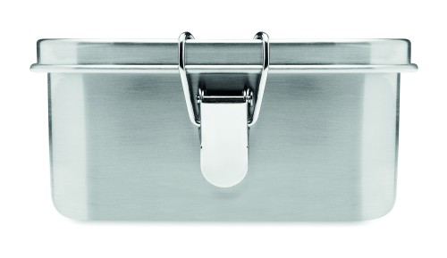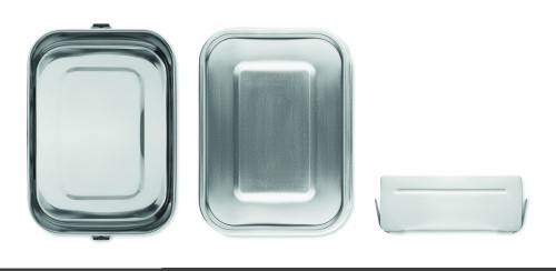 Stainless Steel lunch box with strong and secure side buckles. Including inner divider. Capacity: 1200 ml.