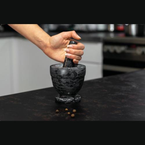 Marble stone mortar with matching pestle. The comfortable weight avoids annoying slipping and conveys quality.