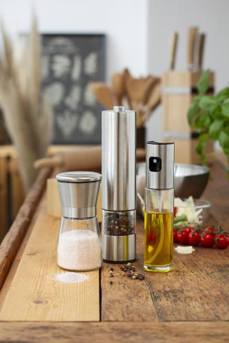 Stainless steel electric salt and pepper mill with ceramic grinder core and LED light. Operates with 4 AA batteries, without batteries.