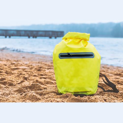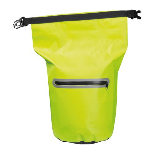 Neon-coloured, waterproof closable bag with shoulder / waist strap, reflective stripes on the front and a filling capacity of 15 liters.