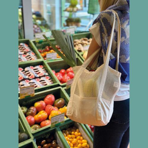Eco Tex Standard 100 cotton bag with crocheted middle section, which makes the bag flexible. 150 g/m²