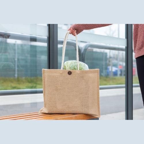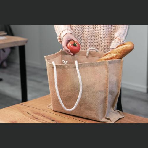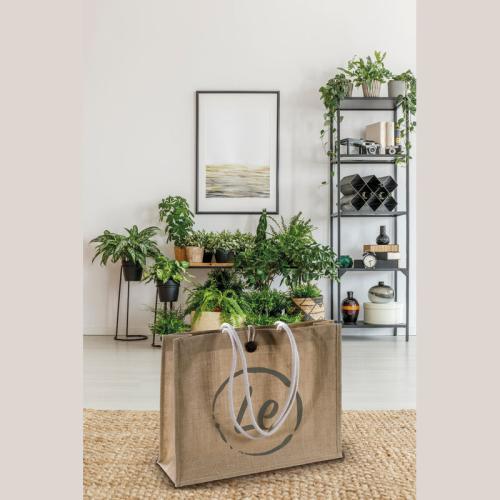 Jute bag with robust cord grips and a closing loop. 320 g/m²