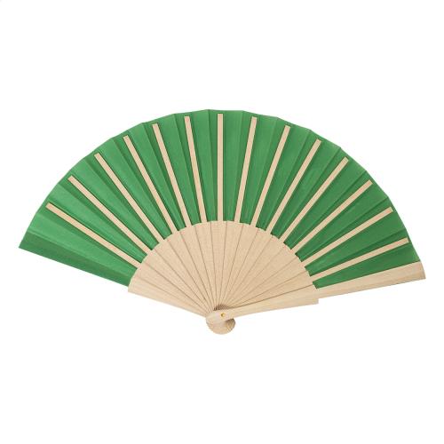RPET polyester hand fan with wooden ribs.
