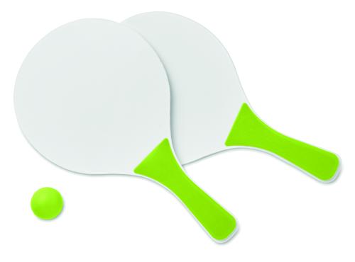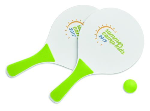 Small beach tennis set consisting of 2 MDF rackets and 1 soft ball.