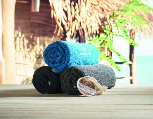 Recycled fabrics eco jacquard bath or beach towel. 70% recycled cotton and 30% recycled polyester SEAQUAL®. 500 gr/m². 70x140 cm. SEAQUAL INITIATIVE works with ocean clean-ups around the world to bring value to the waste that they recover. Made in EU.