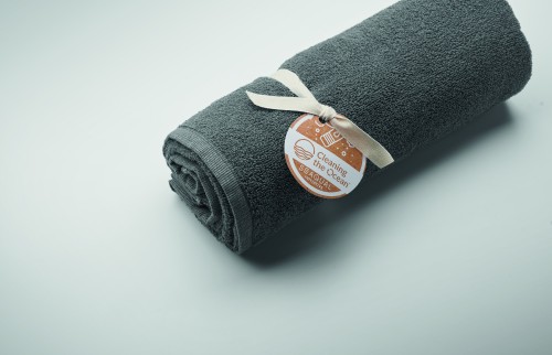 Recycled fabrics eco jacquard bath or beach towel. 70% recycled cotton and 30% ecycled polyester SEAQUAL® YARN. 500 gr/m². 100x170 cm. SEAQUAL INITIATIVE works with ocean clean-ups around the world to bring value to the waste that they recover. Made in EU.