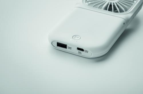 Portable foldable fan with adjustable neck strap. 3 speed settings. Can also be used as desk fan when folded. Including a 3000 mAh power bank. In/Output: Type-C <(>&<)> output type A.