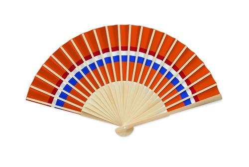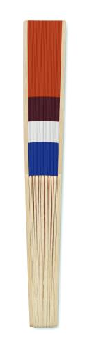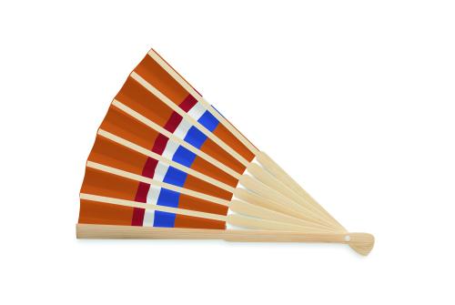 Manual hand fan in bamboo with flag design on paper fabric.