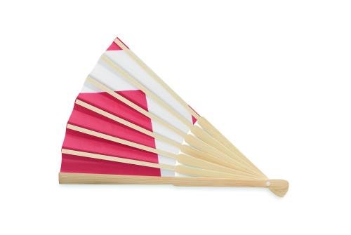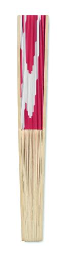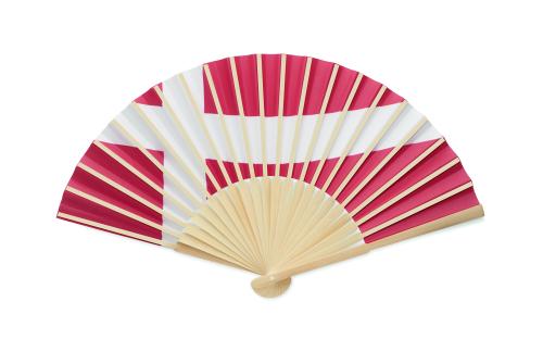 Manual hand fan in bamboo with flag design on paper fabric.