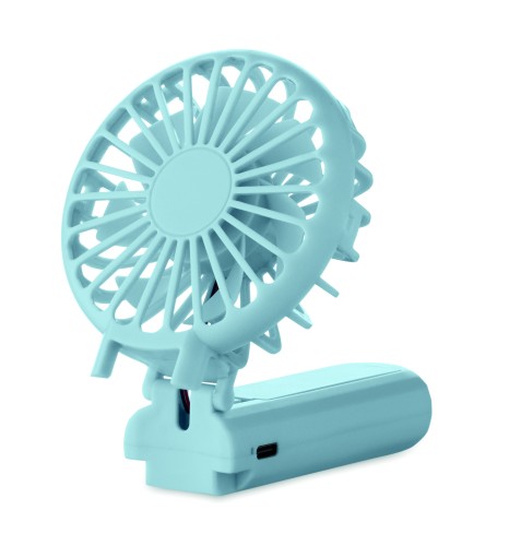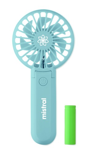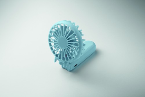 Portable foldable fan in ABS with 3 speed settings. Can be used as handheld or desk fan. Includes 1 replaceable and rechargeable 14500 Lithium battery 500 mAh.