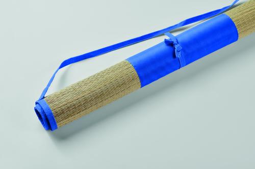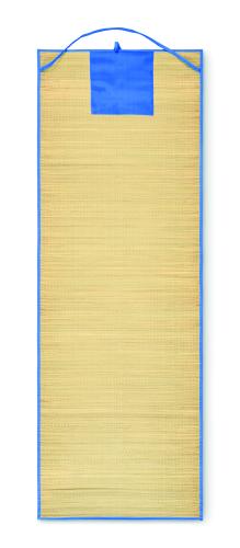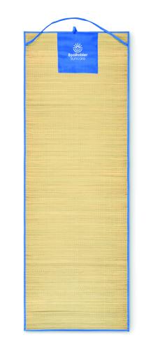 Natural straw roll up beach mat with polyester carry strap.