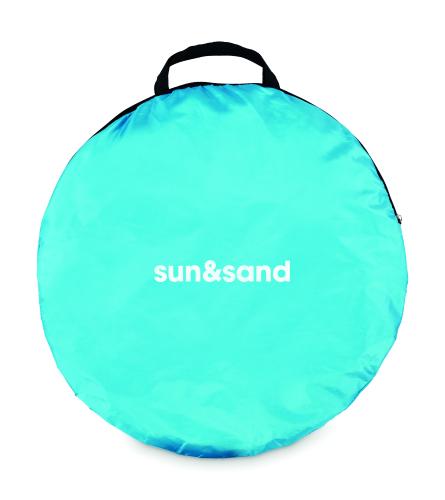 Two-person beach tent made of 190T polyester. Includes 6 steel hooks and a matching carry bag. Lightweight and easy to set up. Designed for shade and outdoor comfort.