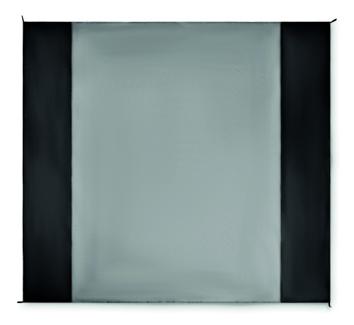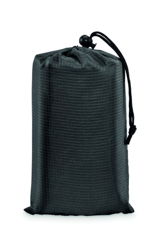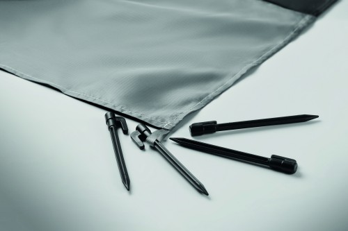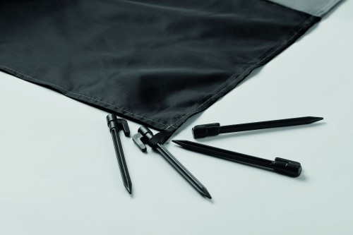 Lightweight beach mat in 210T polyester measuring 200x210cm. Includes 4 black hooks and a matching drawstring pouch for easy carrying.