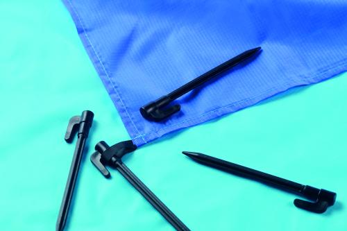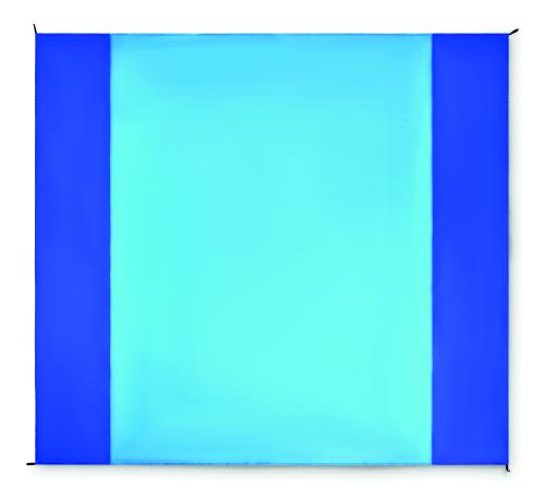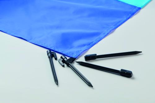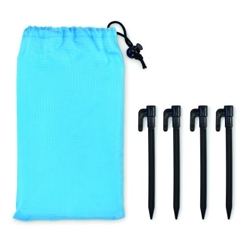 Lightweight beach mat in 210T polyester measuring 200x210cm. Includes 4 black hooks and a matching drawstring pouch for easy carrying.
