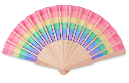 Manual hand fan in wood and polyester fabric with rainbow pattern.