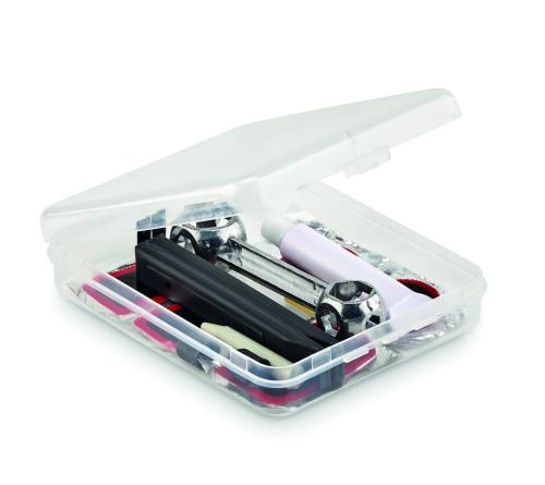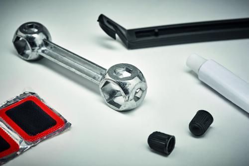 Bike repair kit with 1 wrench, 2 tyre levers, 1 glue, 2 valve caps, 2 valve tubes, 1 grater, 5 repair patches. Presented in transparent box.