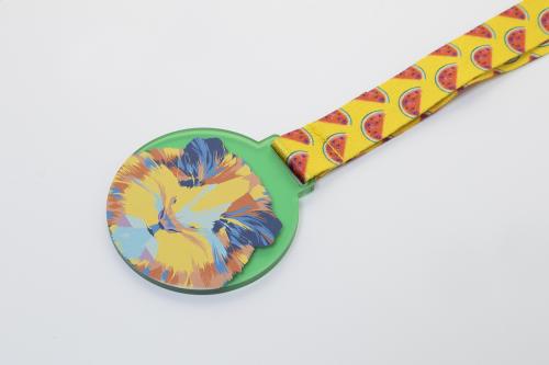 Custom made, acrylic medal with full colour graphics. On sublimation printed RPET lanyard. Price includes sublimation and UV LED printing. MOQ: 100 pcs.