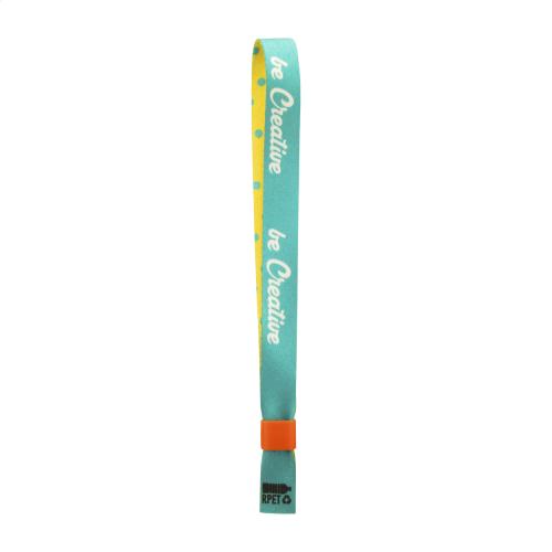 Custom made, RPET polyester festival bracelet with coloured plastic safety lock. With sublimation printed graphics on both sides. MOQ: 100 pcs.