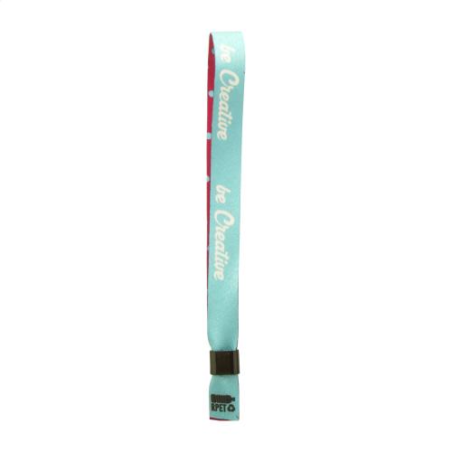 Custom made, RPET polyester festival bracelet with coloured plastic safety lock. With sublimation printed graphics on both sides. MOQ: 100 pcs.