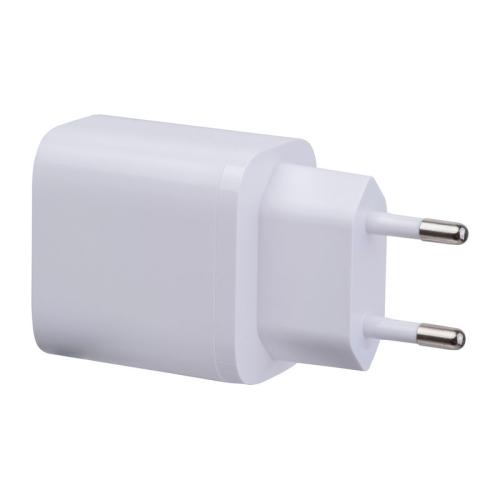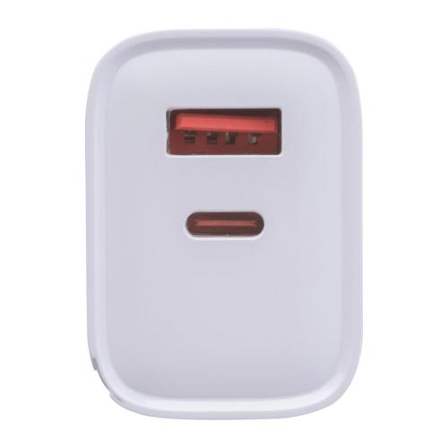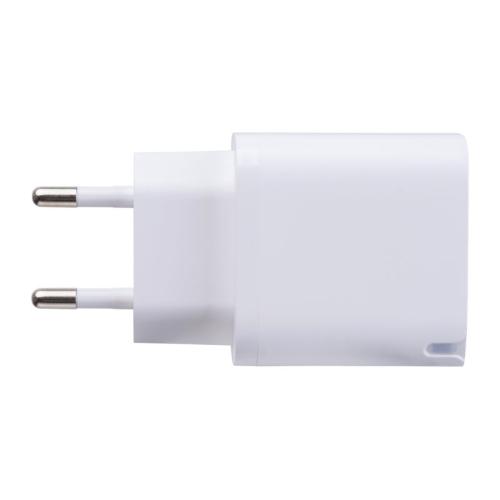 Wall charger plug in with 30W output, equipped with USB-A and USB-C ports as well as fast-charging functionality. Ideal for quickly charging smartphones, tablets, and other devices.