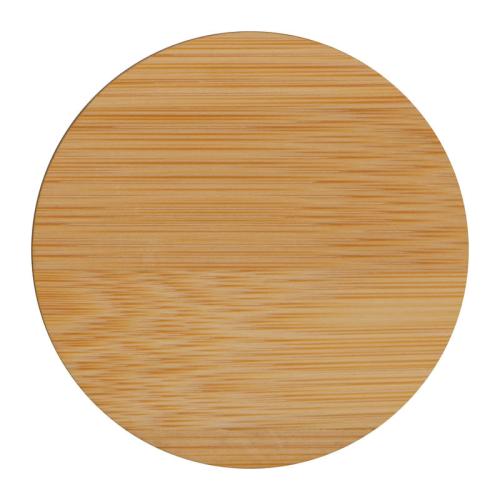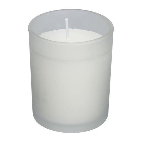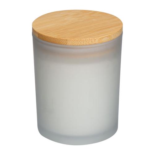 Candle in an elegant frosted glass with bamboo lid, decorative and versatile.