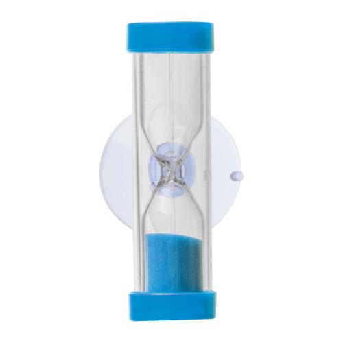 Hourglass made of synthetic material with suction cup and a running time of three minutes. Attachable e.g. to the bathroom mirrror to stay in time while toothbrushing.