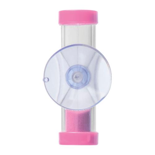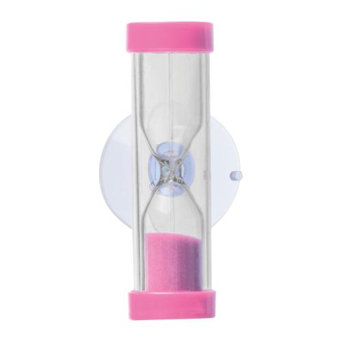 Hourglass made of synthetic material with suction cup and a running time of three minutes. Attachable e.g. to the bathroom mirrror to stay in time while toothbrushing.