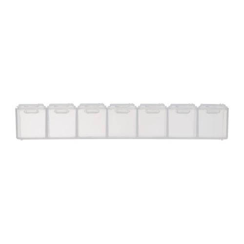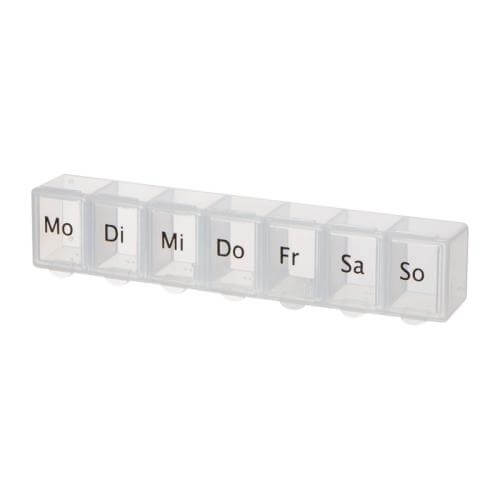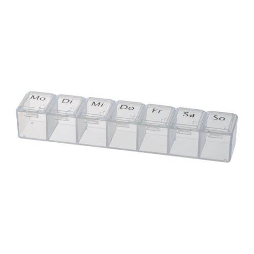 Plastic pill box with 7 compartments for the weekly storage of the required medication. The days of the week are also printed in Braille.