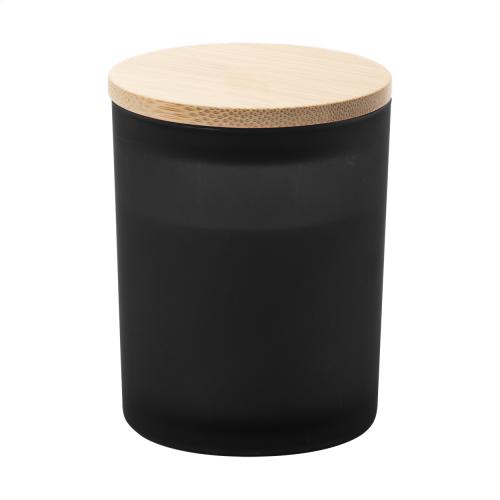 Scented plant-based wax candle in frosted glass holder with bamboo lid. With 120 grams of wax. In kraft paper box.