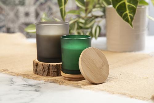 Scented plant-based wax candle in frosted glass holder with bamboo lid. With 200 grams of wax. In kraft paper box.
