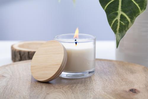 Vanilla scented plant-based wax candle in glass holder with bamboo lid. With 95 grams of wax. In kraft paper box.