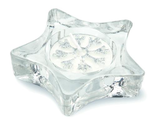 Star shaped glass tea light candle holder in silver box with transparent cover and decorative ribbon. Tea light included.