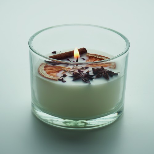 Cinnamon and citrus fragranced plant based wax candle with dried flowers and fruits in glass jar holder. 300 gr. Burn time: 50 hours.