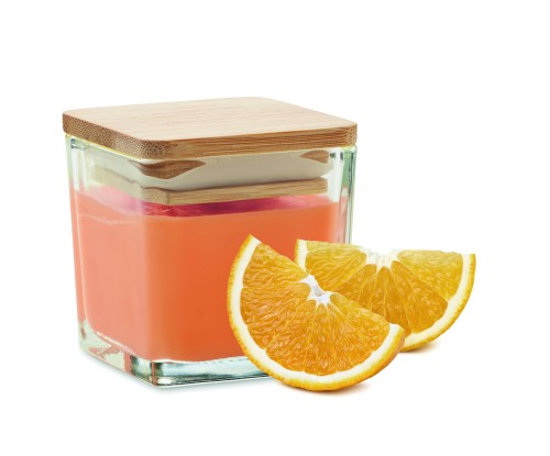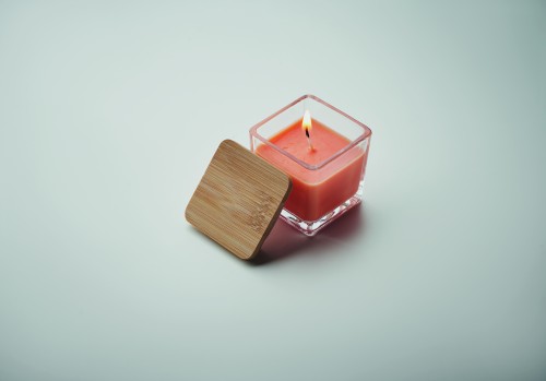 Fragranced plant based wax candle in squared glass holder with a bamboo lid. 50 gr. Burn time: 8 hours. White(06) vanilla, yellow(08) lemon, orange(10) orange, green(48) apple.