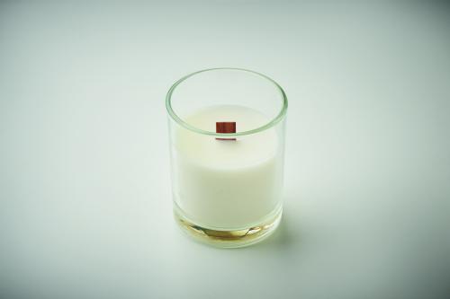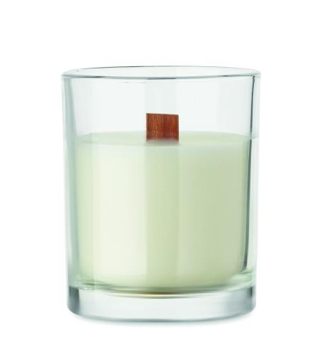 Vanilla fragranced plant based wax candle 80 gr in glass with wooden wick. Burning time 14 hours