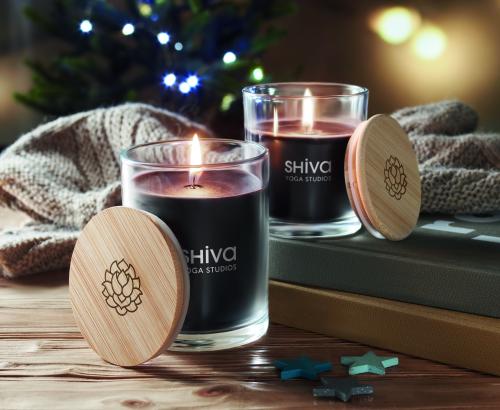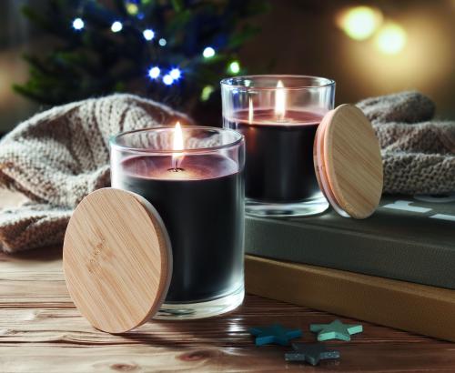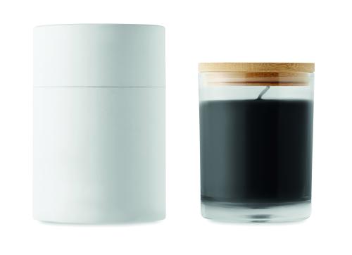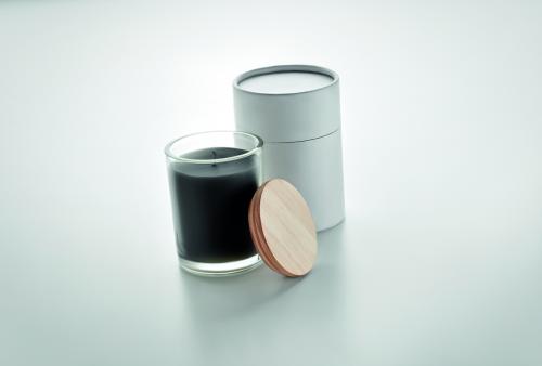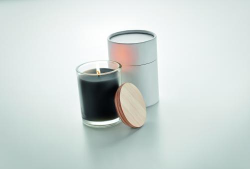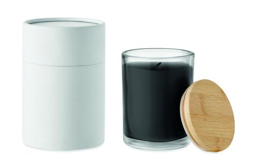Vanilla fragranced plant-based wax candle in glass with a bamboo lid, presented in a 8 cm diameter paper tube gift box. Make the house smell nice with this vanilla scented candle. Close the candle off with the bamboo lid when you are not using it to make it a more natural looking decoration. Burn time: 40 hours. Bamboo is a natural product, there may be slight variations in colour and size per item, which can affect the final decoration outcome.240gr.