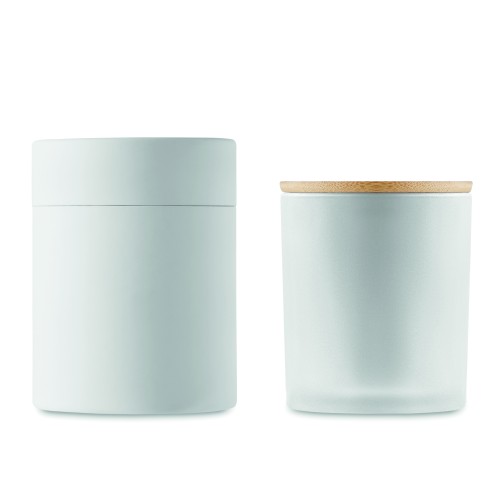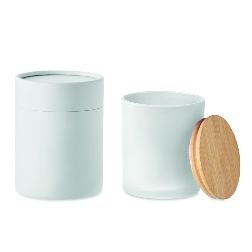 Fragranced plant based wax candle in frosted glass jar holder with bamboo lid. 280 gr. Burn time: 46 hours. Presented in a paper tube gift box. Bamboo is a natural product, there may be slight variations in colour and size per item, which can affect the final decoration outcome.