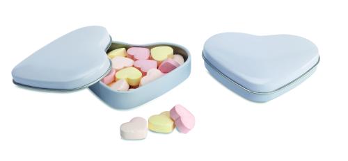 Heart shaped tin box with 24 gr sweet heart shaped candies. You'll love it!