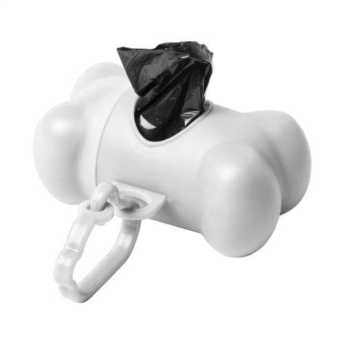 Plastic, bone shaped dog waste bag dispenser with carabiner and 15 bags.
