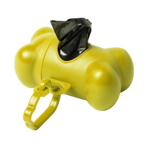 Plastic, bone shaped dog waste bag dispenser with carabiner and 15 bags.