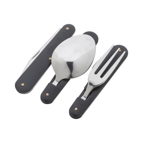 Foldable camping cutlery set in stainless steel with aluminium handles. Including fork, knife and spoon, 300D polyester. In black carry case.