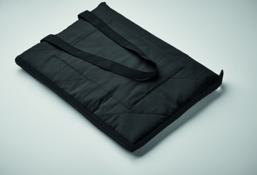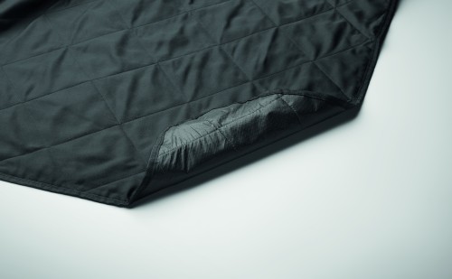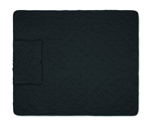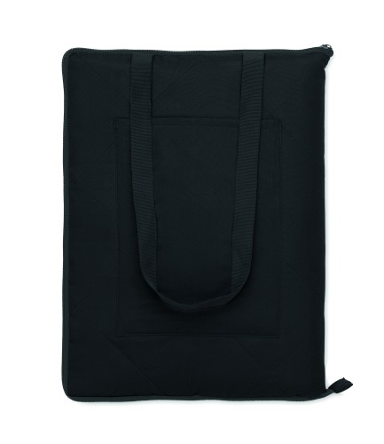 Foldable quilted picnic blanket with plastic coated PEVA on the reverse side. Folds into a convenient carry tote bag and has an adjustable shoulder strap. It includes a large front side pocket.