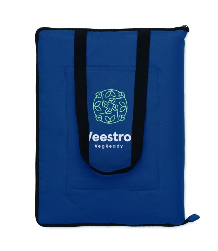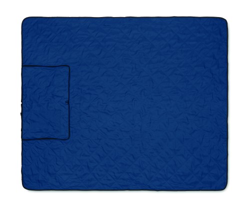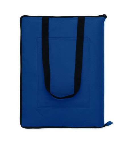 Foldable quilted picnic blanket with plastic coated PEVA on the reverse side. Folds into a convenient carry tote bag and has an adjustable shoulder strap. It includes a large front side pocket.