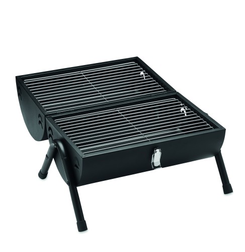 Portable barbecue barrel in iron with chimney and temperature gauge. Black firebox. Locking catch and wooden carry handle.