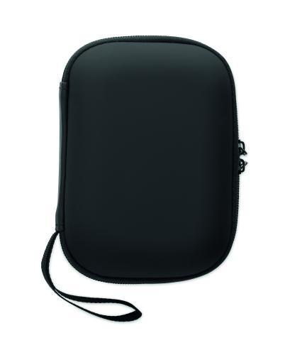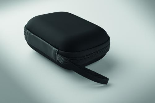 First aid kit in hard PU case. Includes 2 gloves, 1 blanket, 1 tape, 2 bandages, 1 scissors, 4 swabs, 10 plasters and 6 cleaning wipes. Not available for sale outside the EU.