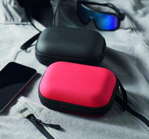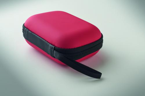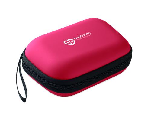 First aid kit in hard PU case. Includes 2 gloves, 1 blanket, 1 tape, 2 bandages, 1 scissors, 4 swabs, 10 plasters and 6 cleaning wipes. Not available for sale outside the EU.