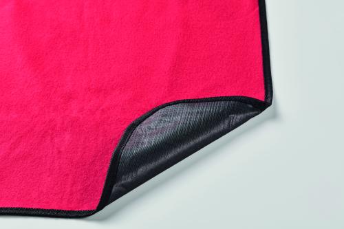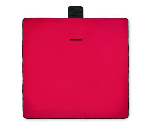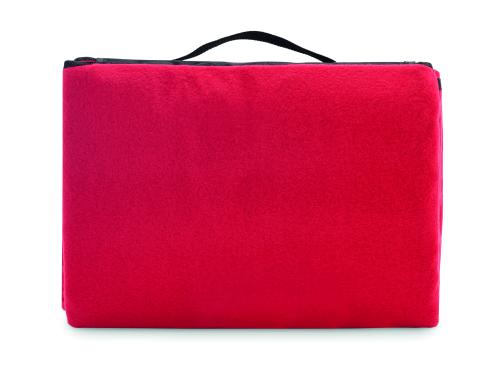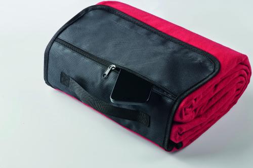 Foldable RPET 150 gr/m² (68% recycled polyester/32% regular polyester) polar fleece picnic blanket with water resistant coated PEVA reverse side. Front flap with zippered pocket and handle.