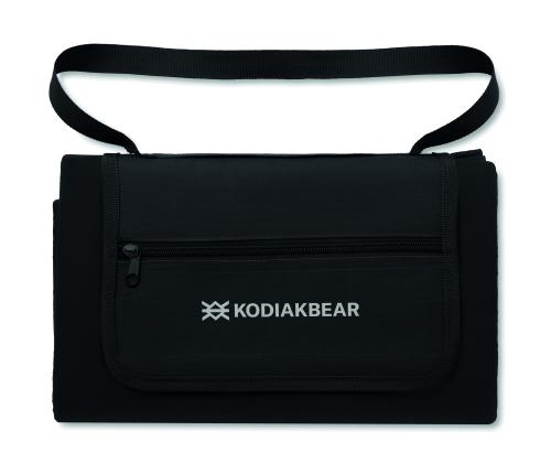 Foldable fleece blanket with plastic coated PEVA reverse side.