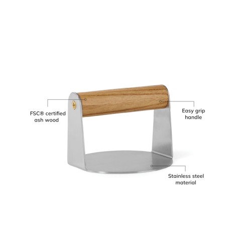 Meet the Paso smash burger press, a must-have for perfect smash burgers and more. Crafted from premium stainless steel with an FSC® certified ash wood handle, it ensures comfort and durability. Its 11 cm diameter is ideal for evenly grilled burgers, pressed sandwiches, or crispy bacon.